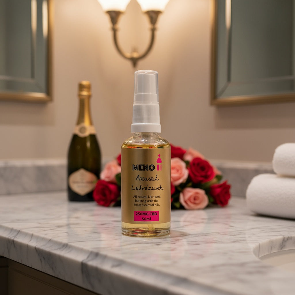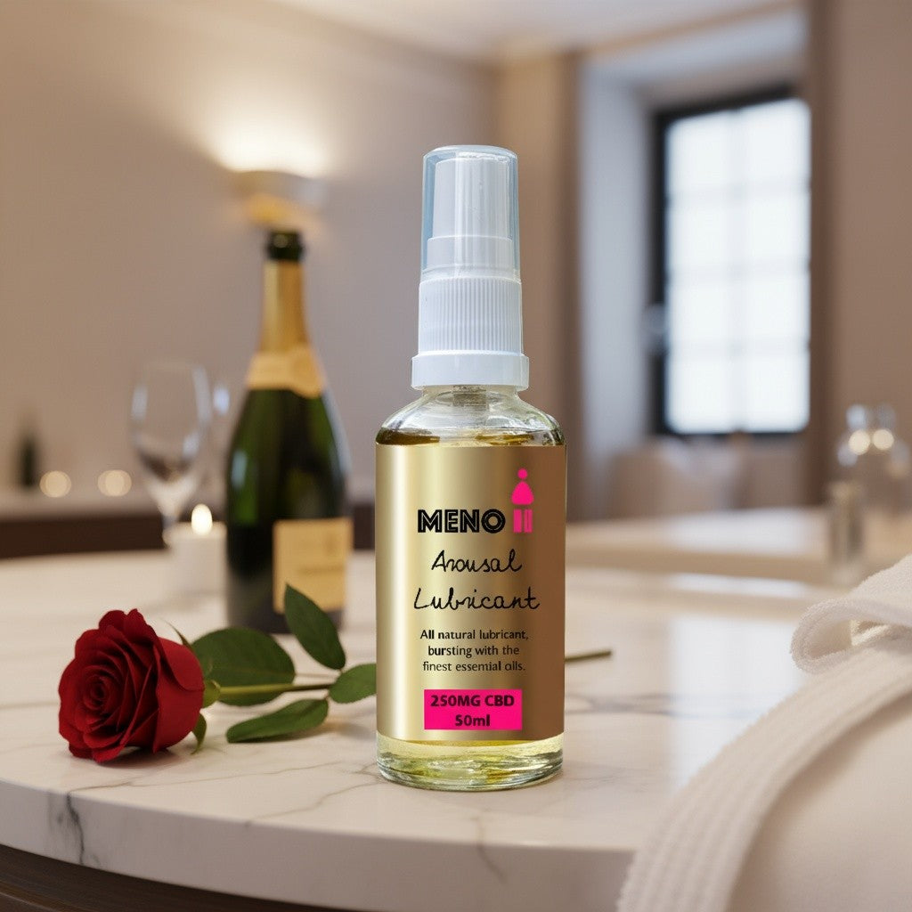 Our Meno CBD Arousal Lube is a luxurious blend of coconut oil jojoba, grape seed oil, peppermint, geranium and ylang ylang, plus 250mg of high end CBD, makes this a 100% natural and safe lubricant, but it not juts for pleasure, it also provides assistance with general wellbeing of your most intimate areas, to help with discomfort during sex.