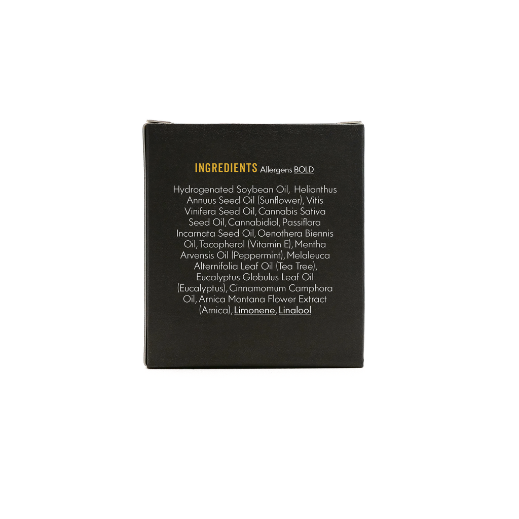 Hydrogenated Soybean Oil, Helianthus Annuus Seed Oil (Sunflower), Vitis Vinifera Seed Oil, Cannabis Sativa Seed Oil, Cannabidiol, Passiflora Incarnata Seed Oil, Oenothera Biennis Oil, Tocopherol (Vitamin E), Mentha Arvensis Oil (Peppermint), Melaleuca Alternifolia Leaf Oil (Tea Tree), Eucalyptus Globulus Leaf Oil (Eucalyptus), Cinnamomum Camphora Oil, Arnica Montana Flower Extract (Arnica), Limonene, Linalool